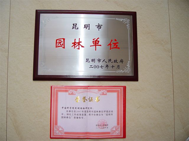 近日从昆明市人民政府获悉,中科院昆明植物所在2007年度昆明市园林单位评选活动中,绿化工作成效显著,被昆明市人民政府授予“昆明市园林单位”荣誉称号。