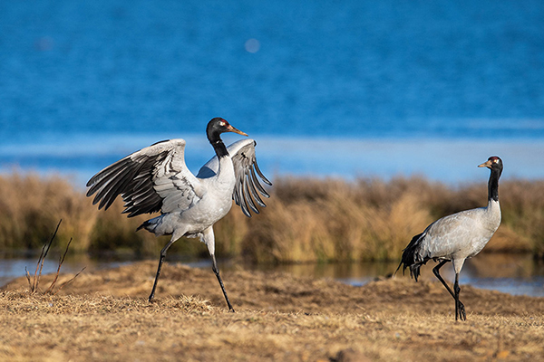 黑颈鹤在云南省昭通市大山包大海子湿地嬉戏(2月24日摄)。新华社记者 胡超 摄