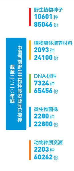 让种子有个安全的家 我国长期利用的中药及民族、民间药用植物达1.2万多种,原产观赏花卉超2000种,同时拥有众多的野生蔬菜水果资源。 “以生物资源为基础的现代生物技术需要大量的生物资源储备,当今,许多国家都投入了大量的人力和财力, 对生物资源进行收集与研究。”回顾起20余年前,吴征镒院士提出建设一座野生生物种质资源库的设想,蔡杰对这位植物分类学泰斗的前瞻性深感敬佩。 1999年,中国科学院吴征镒院士向国家建言,在生物多样性最为丰富的云南建设一座野生生物种质资源库。在得到正式回复后,云南省政府和中国科学院立即展开了科学调研和可行性研究的相关工作。 “种质库项目于2005年正式开工,2007年建成并投入运行。”蔡杰介绍,种质资源库成立之初就确立了“五库一体”的保存模式,即以种子库为核心库,兼具植物离体库、植物DNA库、动物种质库、微生物库。这成为我国科技界和生物学界的一大创新之举。 通过两年建设,几座红白相间的小楼拔地而起,一个直通山腹的冷库常年保持零下20摄氏度的温度……在这里,种子寿命得到极大延长,水稻和小麦的种子可存活3000多年,棉花种子则可存活6.7万年之久。 截至2020年底,种质资源库已保存野生植物种子10601种85046份;植物离体培养材料2093种24100份;DNA材料7324种65456份;微生物菌株2280种22800份和动物种质资源2203种60262份……它与英国“千年种子库”、挪威“斯瓦尔巴全球种子库”等一起成为全球生物多样性保护的重要设施。 “种质资源库的建设使中国的野生生物种质资源,特别是中国特有种、珍稀濒危物种,具重要经济价值、生态价值和科学研究价值的物种安全得到了有力保障,也为我国在未来参与国际生物产业竞争奠定了坚实基础。”蔡杰说。