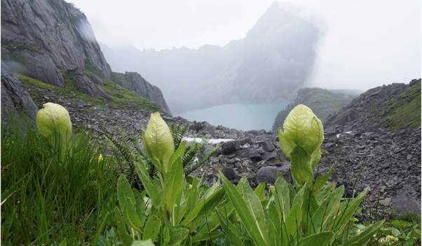 高黎贡山主峰嘎哇嘎普冰蚀湖初干错(邓涛摄) 为积极推进高黎贡山国家安全屏障体系建设,中国科学院昆明植物研究所所长孙航研究员带领“高原植物多样性保护和可持续利用”分队长李嵘研究员、“植物多样性变化调查”分队长邓涛研究员、黄先寒博士等骨干队员,联合高黎贡山国家级自然保护区贡山管护分局的孙军、和正军,共16人组成的科考队,于2021年7月12日-7月17日对高黎贡山主峰嘎哇嘎普冰蚀湖初干错(海拔4023米)及沿线的植物种类、物种分布、群落组成等进行了深入细致的考察。
