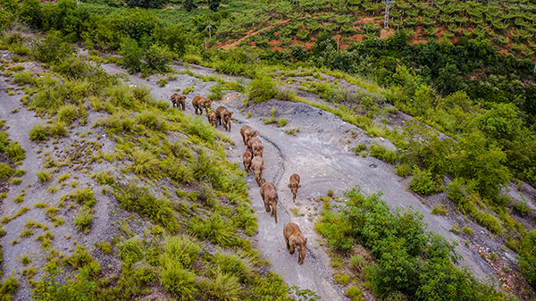 2021年6月7日在云南昆明市晋宁区夕阳彝族乡拍摄的野象(无人机照片)。新华社发