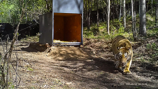 2021年5月18日,在黑龙江省穆棱林业局有限公司林场,之前在密山市获得成功救护的野生东北虎从铁箱子里走出,回归自然(视频截图)。新华社发 世界屋脊,雪域高原,生物多样性也在加速恢复。黑颈鹤由不到3000只上升到8000多只,藏羚羊升至约30万只。第二次陆生野生动物资源调查发现白颊猕猴等新物种5个、东歌林莺等中国新记录物种5个。 大熊猫受威胁程度等级从“濒危”降为“易危”、“微笑天使”长江江豚频繁亮相、三江源国家公园等地的雪豹频繁现身……越来越多关于生物多样性的新闻,成为人们津津乐道的话题。