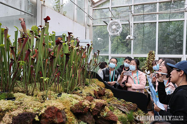 中国日报昆明10月14日电(记者 冯永斌)2021年10月14日,联合国《生物多样性公约》第十五次缔约方大会(COP15)参会记者在“扶荔宫”参观采访。中科院昆明植物研究所昆明植物园“扶荔宫”生物多样性体验园,是此次会议生物多样性室外展览展示项目之一。