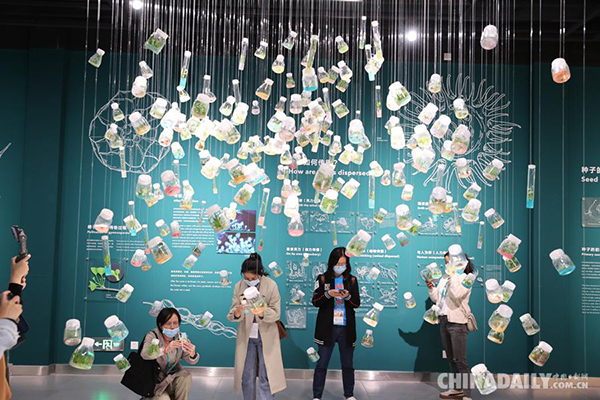 10月14日,COP15参会记者在“扶荔宫”种子博物馆参观采访。(中国日报记者 冯永斌 摄)