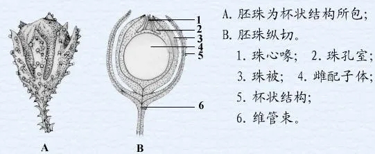 图3. 重建的古蕨属植物 A. 重建的植株的外貌;B. 枝条;C. 生殖枝孢子囊内有大、小孢子之分(百度文库:植物的起源和演化) 前裸子植物在石炭纪演化中有两个主要类群(Hilton, 2007): 1、种子蕨(Pteridosperms),有蕨类的营养体和真正的种子。石炭纪的凤尾松蕨(Lyginopteris oldhamii)就是以种子进行繁殖的,它是目前被研究得最清楚的种子蕨,其种子小型,外有1杯状包被,其上生有腺体,据推测种子蕨可能是苏铁类和被子植物的祖先(Crookall, 1930)。