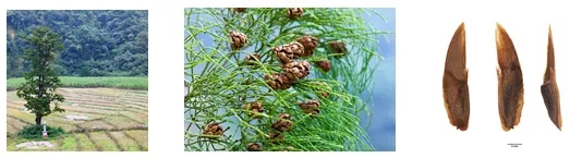 水松植株、水松球果、水松种子(从左到右) 水松(Glyptostrobus pensilis)曾在中生代白垩纪至新生代上新世广泛分布于北半球,但受第四纪冰期的影响,北美、欧洲、日本等地的水松都先后灭绝了,仅在我国的南部和东南部,以及老挝留存至今,成为了古老的残存种,它们对研究杉科植物的系统发育、古植物区系、古地理及第四纪冰期气候都具有重要的科学价值。目前我国的野生水松株数已不到1000株,为国家Ⅰ级保护植物,IUCN红色名录极危种,急需人们的精心保护和深入研究。 水松种子长5.85-8.28毫米,宽2.42-4.02毫米,厚1.03-2.08毫米(不带翅),呈长椭圆形或卵状披针形;背腹面稍扁;两侧具棕褐色、纸质狭翅,顶部具长3.52-8.81毫米的矩圆状披针形长翅。这些形态结构特点不仅能使水松种子借风飘离母株一段距离,减小子代与亲代的竞争,得到更大的生存机会,拓展种群空间;还能在落水的情况下,继续漂浮于水面一段时间,在风的吹送下,寻找到安全的着陆点,发芽生长,完美适应母株生长于河流两岸这一习性。 在生理方面,水松种子没有休眠;且胚已分化完全,具有了3-5枚长2.20-2.41毫米的条状针形子叶,以及长3.77-4.11毫米的圆柱形下胚轴。因此能在适宜条件下,快速萌发,尽早成苗;并在丰富胚乳的支持下,快速生长,在与其它物种种子该环节的竞争中取得胜利。 水松之所以能够经历上亿年地质与气候变化而幸存下来,种子确实功不可没!