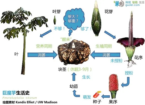 巨魔芋巨大的叶片和球茎(图片来自网络) 巨魔芋在营养周期的生长过程中,每年都只长出1片叶子,在生长周期的后阶段,叶柄可高达3-4m,叶片直径超过5m。巨魔芋通常需要经过至少7年的积蓄,球茎长到50cm左右且储存足够的养分后才能开花。 进入生殖周期后,首先形成的是“肉穗花序”。在肉质的花序轴上,密集地生长着许多小花,雄花在上,雌花在下,它们一起构成“肉穗”,并且被一大片“佛焰苞”裹起来。肉穗花序会自己发热,温度可达36℃以上,大量散发出模仿腐肉的臭气,这些气味物资主要为二甲基二硫化物和二甲基三硫醚,吸引食腐的昆虫麻蝇和埋葬甲来传粉。