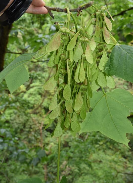 极小种群“明星植物”漾濞槭被称为“植物界的大熊猫”。近日,中科院昆明植物研究所极小种群野生植物综合保护团队在文山老君山国家级自然保护区、景东无量山国家级自然保护区等地开展槭属植物野外调查时,发现了2个漾濞槭的新种群,并经华南植物园陈又生研究员确认。 漾濞槭果序 中科院昆明植物所供图 漾濞槭是华南植物园陈又生研究员2003年发表的槭属植物新种,种群及个体数量稀少,被称为“植物界的大熊猫”,列为云南省第一批20个亟待拯救和保护的极小种群野生植物之一(《云南省极小种群物种拯救保护规划纲要(2010-2020)和紧急行动计(2010-2015)》),在2021版国家重点保护野生植物名录(国家林业和草原局 农业农村部〔2021〕15号)被纳入II级重点保护。此前所有种群仅在云南大理的漾濞县和云龙县境内发现,全部个体仅746株。 此次由中科院昆明植物研究所极小种群野生植物综合保护团队发现的2个漾濞槭种群,均在国家级自然保护区内。其中,文山老君山国家级自然保护区内发现的漾濞槭种群最大,约80余株,胸径最大者达133 cm,伴生有野核桃、水青冈、水青树、房县槭、云南金钱槭、竹类等物种。景东无量山国家级自然保护区内发现的漾濞槭种群有30株,胸径最大者达48 cm,伴生有白檀、房县槭、扇叶槭、核桃等物种。