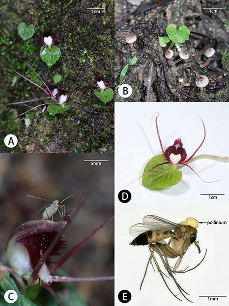 双凸铠兰的生境、花形态和传粉昆虫。A. 生境 B. 同域分布的小脆柄菇 C. 怀孕的雌性蕈蚊停在中萼片上 D . 花特写 E. 携带双凸凯兰花粉团的雌性费菌蚊 铠兰属隶属于兰科、兰亚科、双尾兰族、针花兰亚族。铠兰属分布在喜马拉雅至东南亚、新几内亚、新西兰、澳大利亚及其一些岛屿上,中国是该属分布的北界。全属约 140 种,其中国内分布6种。铠兰属植物生长在阴湿的环境、花朵的唇瓣形似蘑菇,一直被推测为是拟态真菌。但自该假说提出几十年来,对其传粉生态学的研究仍然很零星,而且除了澳洲的少数爱好者拍摄的照片之外之外,该属的传粉昆虫有观察到实质性的证据,以至于对真菌拟态假说往往没有定论。由于铠兰花朵较小,十分不容易观察,因此开展野外实验非常困难。昆明植物研究所研究人员克服重重困难,在花期内对双凸铠兰和杉林溪铠兰进行了传粉生态学研究,详尽调查了两种铠兰的生境、花期、花形态特征,开展了野外传粉昆虫观察,以及繁育系统套袋实验。