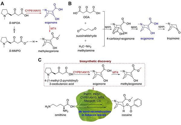 近期,研究团队综合利用转录组分析、分子生物学以及有机化学合成等手段,解决了长期遗留的可卡因托品烷骨架构建的世纪难题,并在烟草中实现了可卡因合成路径的从头构建。此项研究,鉴定了负责可卡因托品烷骨架构建的氧化酶和甲基转移酶相关物质,明确了可卡因托品烷骨架的形成过程,纠正了长期存在但不正确的MPOA先甲基化后再氧化的猜想,再次阐明了经典托品酮化学全合成的仿生合成之美。 在此基础上,研究人员进一步利用体外酶促实验表征了相关氧化酶和甲基转移酶的底物手性选择性,解决了可卡因生物合成路径中如何从消旋的MPOA生成手性托品烷骨架的疑惑,最终利用氧化酶CYP81AN15和甲基转移酶MT4,以及四个已鉴定的功能酶在烟草中组建最简生物合成路径。 (中国科技网 2022年11月29日) |