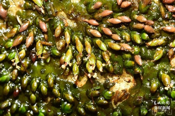 水苔花的花和果 陈俊通 摄 它的整个花约1-2毫米,花被片退化成极小的鳞片状,因此在野外如果不是大面积开花,很难发现它。水苔花的根呈叶状体状,绿色,靠吸器紧贴于水中的石头上,形似地衣,因而也称之为水石衣。显然,为了在急流中安家落户,水苔花利用发达的根系紧紧地贴在流水的石头上,并吸收流水中的营养物质。另外,很有意思的是,水苔花的花常常会随着水位的下降依次开花,长时间暴露于空气中的植株的根茎叶通常会凋亡脱落,而果枝可以借助吸器保存更久。