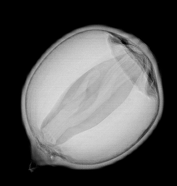 种子形态研究 对正确处理和贮藏种子极为重要 “你看这个豆科决明种子。”李涟漪指着X光照片,记者看到照片上的种子,有的内部是好的,有的却藏着个虫宝宝,但外表看起来都一样。 李涟漪说:“豆象将卵放入雌蕊柱头内,幼虫沿着雌蕊的花柱向下进入子房,再分散进入胚珠。胚珠所发育成的种子里就已经‘埋伏’下豆象的幼虫。”如果不用X光机拍摄,或者不切破种皮,是根本不知道哪些种子被虫蛀了。