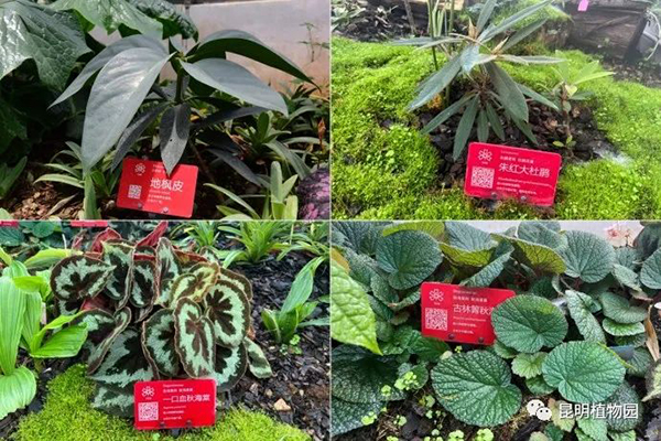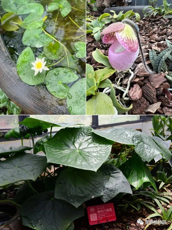 ▲保育温室的部分植物:1. 地枫皮Illicium difengpi;2. 朱红大杜鹃Rhododendron griersonianum;3. 一口血秋海棠Begonia picturata;4. 古林箐秋海棠Begonia gulinqingensis;5. 茈碧莲Nymphaea tetragona;6. 硬叶兜兰Paphiopedilum micranthum;7. 贵州八角莲Dysosma majoensis。