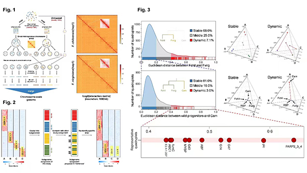 草莓具有重要的经济和营养价值,现代八倍体栽培草莓起源于两个八倍体野生种弗州草莓和智利草莓的种间杂交。近日,中国科学院昆明植物研究所研究员朱安丹专题组深入解析了八倍体草莓的起源和遗传分化特征。相关研究成果在线发表于《自然-植物》。 朱安丹表示,由于草莓属系统发育解析涉及未知的祖先、同源染色体交换和不完全谱系分选等问题,学术界至今对八倍体草莓的二倍体祖先问题存在较大的争议。此外,八倍体草莓在驯化过程中的亚基因组的同源偏向性表达及转变模式并不明确。 该研究提出了一套适用于多倍体的ALLHiC迭代挂载流程,构建了两个八倍体野生草莓智利草莓和弗州草莓染色体水平的高质量分型基因组。研究人员完成了八倍体草莓亚基因组的分离,并在此基础上采用不同的分析方法重新追溯了八倍体草莓的二倍体祖先。 研究结果纠正了国外学者在亚基因组分配上的错误,并进一步确定森林草莓和饭沼草莓是八倍体草莓现存的二倍体祖先种。研究还探讨了八倍体草莓在驯化过程中的同源偏向性表达分化,并基于空间四联体方法完成了八倍体草莓的静态和动态的同源偏向性分析,并鉴定到了一些重要的转录因子在驯化过程中发生了表达偏倚。