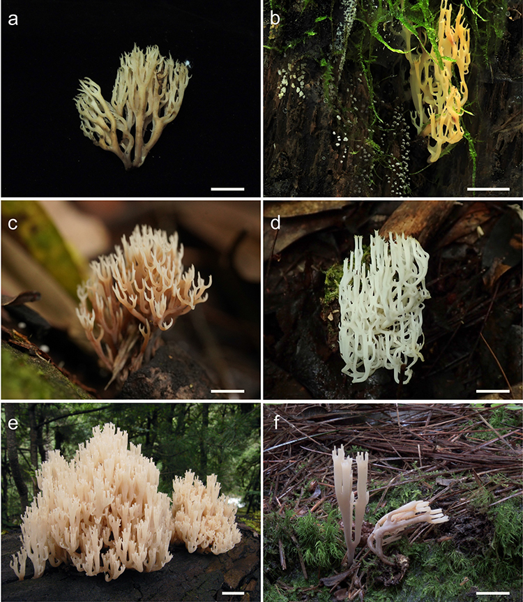 图1 分布于高黎贡山及其周边地区的密瑚菌属物种。(a)褐白密瑚菌;(b)毛脚密瑚菌;(c)羽瑚菌状密瑚菌;(d)雪白密瑚菌;(e)杯密瑚菌;(f)云南密瑚菌。 高黎贡山位于滇西中缅边境,是中国西南重要的生态安全屏障和生物多样性保护的关键地区。作为生态系统运转中不可或缺的角色,大型真菌在维持生态平衡和稳定中具有重要作用。但因真菌家底不清,严重阻碍了该区域生物多样性的全面有效保护。 在国家自然科学基金NSFC-云南联合基金重点项目的资助下,中国科学院昆明植物研究所杨祝良研究员团队对高黎贡山不同海拔高度及不同植被类型下的大型真菌开展采集工作,并根据标本的形态特征、生态分布特点和分子系统发育证据,共鉴定出该区大型真菌121科380属1500余种,潜在新物种约50种。