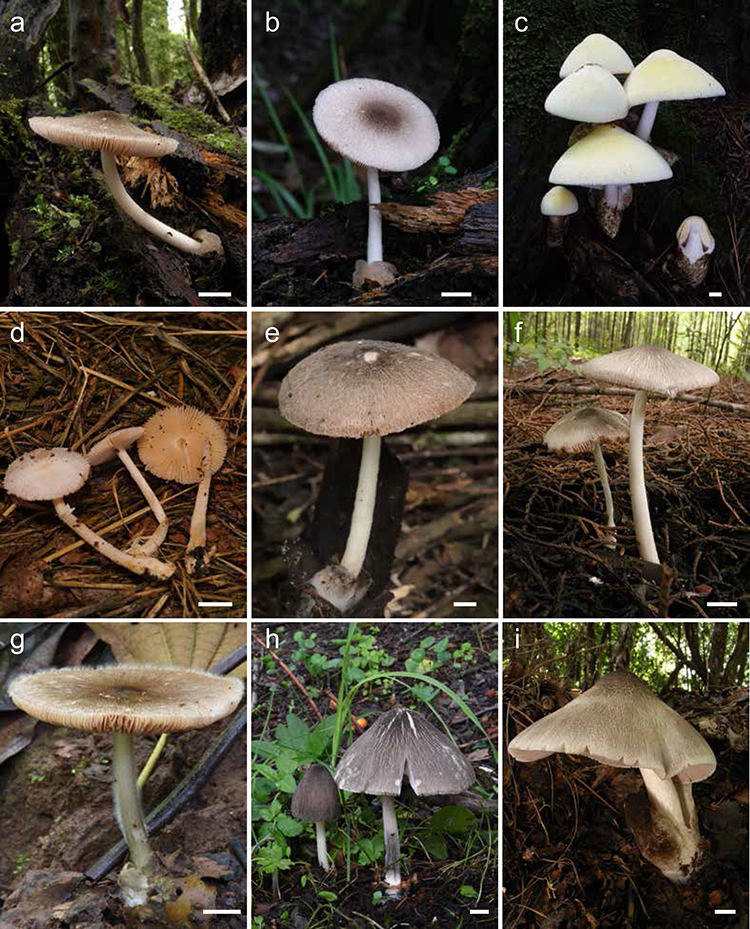 图3 分布于高黎贡山及其周边地区的草菇属物种。(a–b)毛盖草菇;(c)银丝草菇;(d)白毛草菇;(e)莫氏草菇;(f)小裂盖草菇;(g) 灰褐草菇;(h)裂盖草菇;(i)草菇。 据悉,上述新种和新记录种的发现只是高黎贡山大型真菌多样性研究的一个阶段性成果。研究团队将继续深入研究高黎贡山地区大型真菌的物种多样性、演化规律以及与其他生物之间的相互关系,为高黎贡山的生物多样性保护和可持续利用提供更多科学依据和技术支持。 (人民日报客户端 2025年4月9日) 来源:https://www.peopleapp.com/column/30048742697-500006190497 |