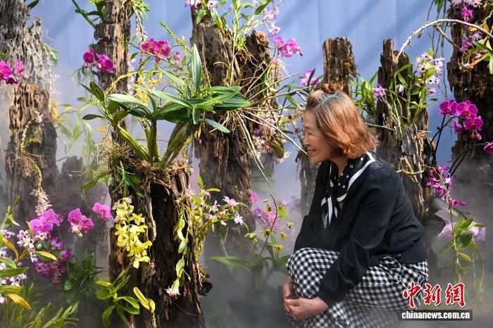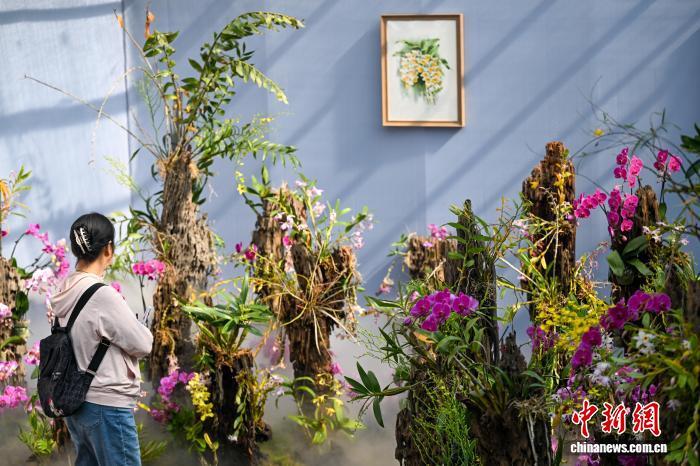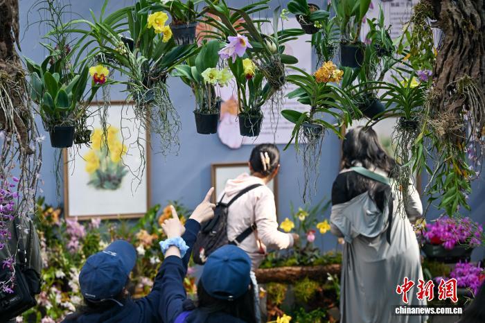 4月15日,云南昆明,悬挂着的舒罗卡特兰吸引观众。当日,中国科学院昆明植物研究所昆明植物园第三届兰花展在扶荔宫兰花馆开幕,本届兰花展以“兰芷若芳 一室生春”为主题,展出近400种兰花。中新社记者 李嘉娴 摄