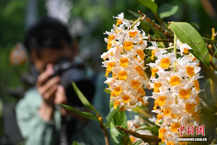 4月15日,云南昆明,属于兰科的鼓槌石斛盛开吸引观众拍摄。当日,中国科学院昆明植物研究所昆明植物园第三届兰花展在扶荔宫兰花馆开幕,本届兰花展以“兰芷若芳 一室生春”为主题,展出近400种兰花。中新社记者 李嘉娴 摄