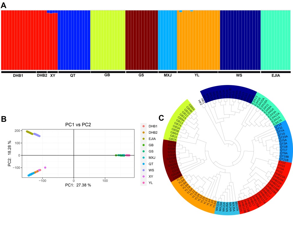 图2 (A) 种群结构、基于全部位点的 (B) PCA 聚类和 (C) ML 树