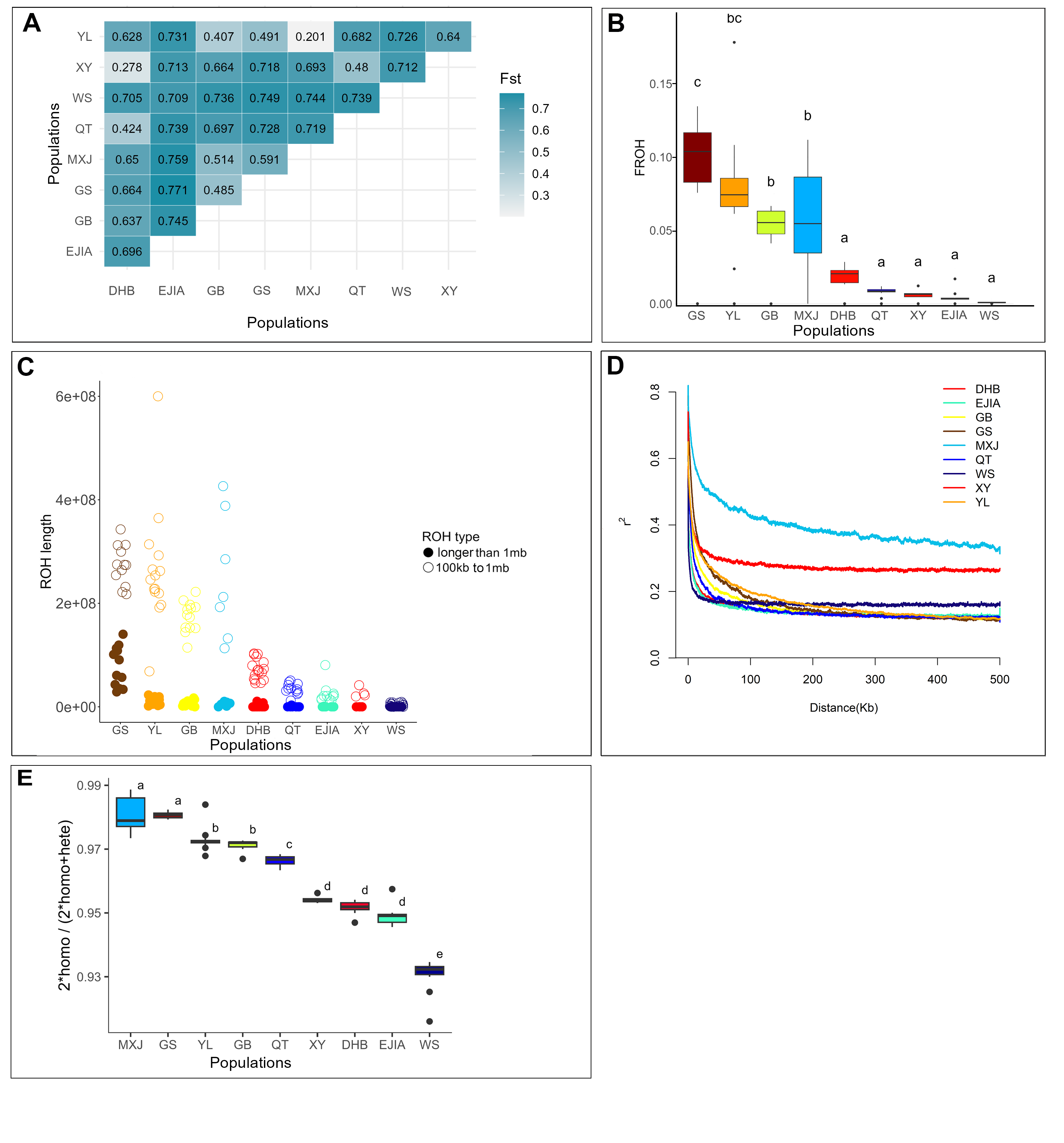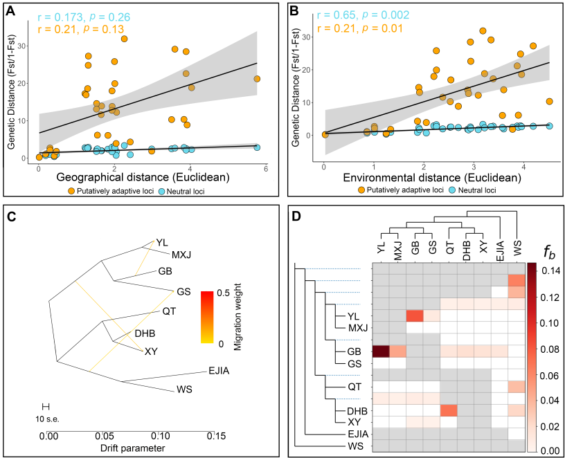 图4 (A) 中性位点和适应性位点的距离隔离(IBD)、(B) 环境隔离(IBE)、(C) 种群关系与推断的基因流、(D) Dsuite热图显示种群间的基因渐渗