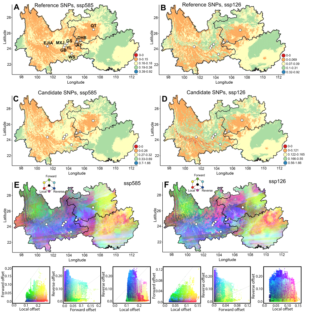 图5 在SSP585和SSP126情景下,使用参考SNP(A, B)和适应性SNP(C, D)对2100年的遗传偏移进行预测、(E)SSP585和(F)SSP126下多维偏移的RGB可视化