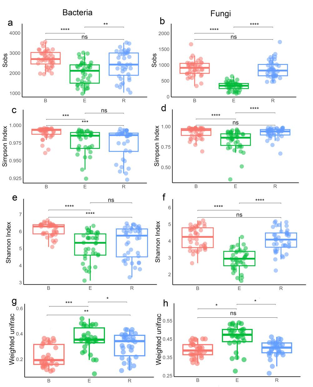 图7 不同组织微生物群落的α多样性和β多样性:细菌(a)和真菌(b)群落的Sobs多样性指数;细菌(c)和真菌(d)群落的Simpson多样性指数;细菌(e)和真菌(f)群落的Shannon多样性指数;基于加权UniFrac距离矩阵的细菌(g)和真菌(h)群落的Beta多样性 该研究为极小种群野生植物弥勒苣苔的紧急保护提供了关键依据。首先,研究鉴定出能增强植物生存能力的耐旱和促进生长的共生微生物,这些有益微生物或可用于提高迁地栽培和回归植株的恢复力;其次,研究团队记录了跨种群的稳定核心微生物群落,表明在原生境保护中,土壤微生物组的保护应与植物保护同等优先;第三,功能分析揭示了参与胁迫耐受性的微生物通路,为监测不断变化的环境中的植物健康提供了潜在的生物标志物。这些研究结果通过鉴定弥勒苣苔的关键微生物组分维持其种群,为制定保护策略提供了直接依据。 该研究以Comparative root associated microbial community analysis of Oreocharis mileensis, a resurrection plant species with extremely small populations为题发表在国际期刊Frontiers in Microbiology。中国科学院昆明植物所Temur Asatulloev博士研究生为论文的第一作者,中国科学院昆明植物所孙卫邦研究员、蔡磊副研究员、乌兹别克斯坦科学院植物研究所Komiljon Sh. Tojibaev院士为共同通讯作者,乌兹别克斯坦科学院植物研究所Ziyoviddin Yusupov博士、昆明植物所陈秋平博士和Bishal Gurung博士参与了研究。 基于以上多维度研究结果,研究团队提出了弥勒苣苔具体的保护策略。包括划定八个基于遗传信息的管理单元(广西大哄豹DHB和贵州兴义XY种群为一个单元,其余每个种群各为一个独立单元),促进相容种群间的辅助基因流,并对高度隔离的种群实施迁地保护、栖息地恢复等以缓解遗传侵蚀并增强适应性恢复力。研究团队还建议将微生物组评估纳入现有保护计划,并应用微生物强化技术以增强迁地保护成效。这一聚焦微生物的方法为保护该濒危物种应对气候变化与生境退化提供了新视角。总体而言,这两项研究深入解析了脆弱喀斯特生态系统中支配物种存续的进化驱动力与植物-微生物组互作机制,并提出了一个可操作的综合性的保护框架。以上研究工作得到了国家重点研发计划(2024YFF1307400)、云南省重点研发计划(202403AC100028)、云南省基础研究计划(202301AT070318)等项目的支持。 |
