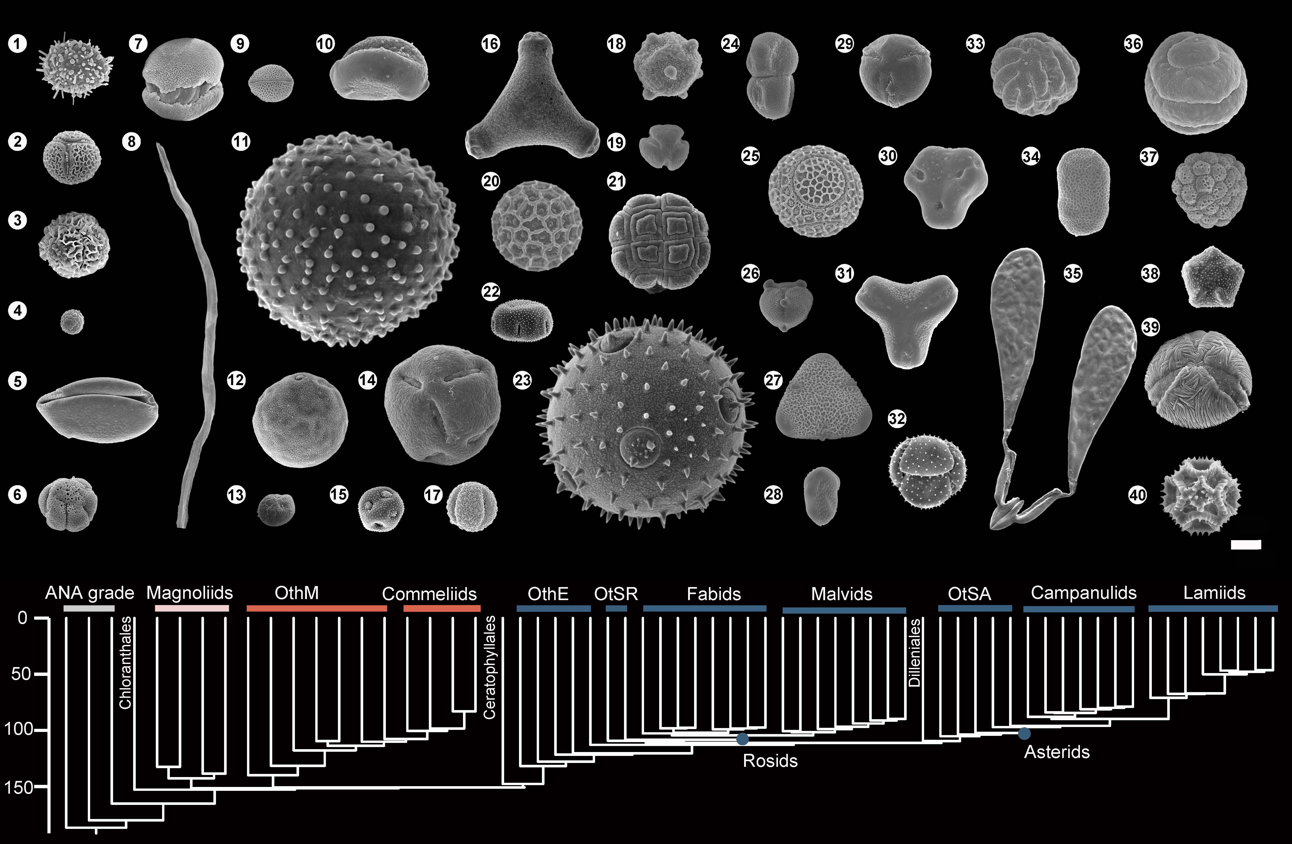 被子植物(有花植物)花粉形态复杂多样,是植物分类与系统演化研究以及古植物与古生态学研究的重要依据。近日,中国科学院昆明植物研究所中国西南野生生物种质资源库联合国内外多家科研机构,通过编码被子植物APG IV系统现存64目434科1880属的花粉特征数据,结合来自三套基因组12个基因片段的属级水平时间校准的分子系统发育树,定量研究了花粉形态多样性(pollen disparity)的演化历程,揭示了其脉冲式演化模式,为理解被子植物的快速辐射演化提供了独特的微观结构视角。 确定生命之树中形态多样性的产生及其演化模式,是进化生物学研究的核心挑战之一。作为被子植物的多细胞单倍体生命阶段,花粉粒尽管仅参与开花后从花药散布到柱头授粉的短暂旅程,但其外壁展示出惊人的形态变异。这些微米级的精细结构是自然界中最为复杂的微观结构之一,不仅是植物分类和系统演化研究的“指纹”,更是植物适应陆地环境的关键策略之一。