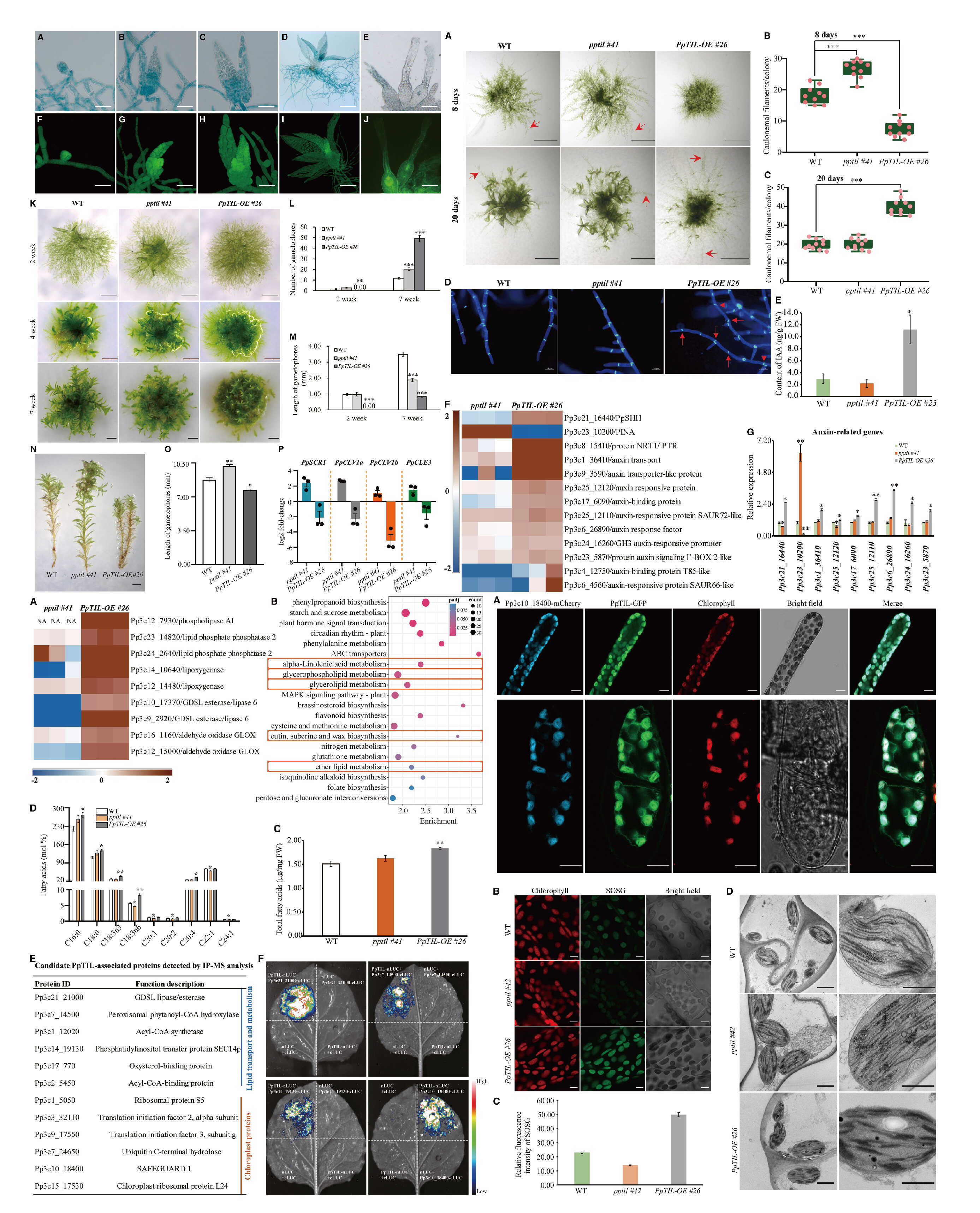 图2 PpTIL参与调控二维生长向三维生长转变、茎叶体发育、脂质代谢和¹O₂胁迫