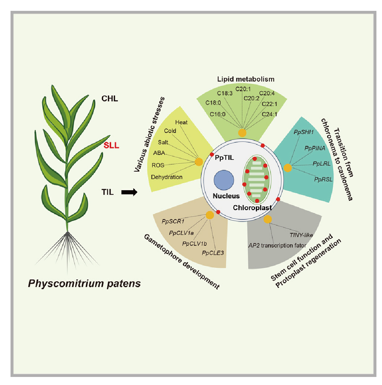 载脂蛋白家族起源古老、功能多样,广泛分布于原核和真核生物中,通过结合疏水分子、参与受体互作等方式行使多种生理功能。在动物中,载脂蛋白的扩张和新功能化与脊椎动物从水生到陆生的演化密切相关;植物载脂蛋白通常被分为叶绿体载脂蛋白(CHLs)和温度诱导的载脂蛋白(TILs)两类,其在植物从水生到陆生适应演化中的功能与进化研究尚属空白。 中国科学院昆明植物研究所研究团队近期通过系统发育分析,鉴定出植物载脂蛋白的第三个类型——非种子植物特异性载脂蛋白(seedless-plant-specific lipocalins, SLLs),该类群主要存在于轮藻、苔藓和蕨类等非种子植物中,在种子植物中则发生丢失,表明其可能与早期陆生植物的环境适应相关。TIL在植物各大类群中广泛分布,且与细菌载脂蛋白序列亲缘关系接近,可能通过水平基因转移事件从细菌中获得。该研究以小立碗藓为实验材料,进一步系统解析了TIL载脂蛋白在植物中的生物学功能与分子作用机制。 研究结果表明,PpTIL与有花植物拟南芥AtTIL的氨基酸序列和蛋白三级结构高度保守。PpTIL基因的表达受高温、低温、盐胁迫、干旱和脱落酸显著诱导,其功能缺失突变体对热胁迫高度敏感,活性氧积累显著增加;而基因过量表达则提升植株的热胁迫耐受性,拟南芥AtTIL基因能回补PpTIL基因缺失突变体的热胁迫敏感表型,表明TIL基因在陆生植物非生物胁迫响应中的功能保守性。与有花植物TIL仅定位于质膜不同,PpTIL在叶绿体和质膜均有定位,且参与调控小立碗藓的多个关键发育过程。在原丝体发育阶段,PpTIL通过参与生长素的生物合成与转运,影响绿丝体向轴丝体的转变。在植株形态建成中,PpTIL参与调控苔藓从二维到三维的生长转变,基因缺失突变体更早形成茎叶体,而过表达植物的茎叶体发育则显著延迟,且成熟后基因缺失和过表达株系的茎叶体数量均显著增加但体积变小,与三维生长标记基因PpSCR1、PpCLV1a/b、PpCLE3等的表达变化高度相关。此外,PpTIL还调控发育相关转录因子的活性,影响植物原生质体的再生与分化过程。 载脂蛋白的经典功能为参与脂质运输和代谢,该研究也证实了PpTIL在小立碗藓脂质代谢中发挥关键调控作用。转录组和脂质组分析显示,PpTIL基因缺失和过表达株系中多个脂代谢相关基因表达显著变化,过表达株系的总脂肪酸含量提升约20%,其中棕榈酸(C16:0)、硬脂酸(C18:0)、亚麻酸(C18:3)等膜脂重塑关键脂肪酸含量显著增加,而基因缺失突变体中苔藓适应逆境的超长链多不饱和脂肪酸(C20:1、C20:2、C22:1、C24:1)含量显著降低。通过免疫共沉淀-质谱(IP-MS)和双荧光素酶互补实验,研究人员鉴定出多个PpTIL的互作蛋白,包括GDSL脂肪酶、磷脂酰肌醇转移蛋白等脂代谢关键蛋白,进一步证明PpTIL通过与脂代谢相关蛋白互作,调控脂质的合成与运输。同时,PpTIL还与叶绿素降解相关的PAHX(phytanoyl-CoA hydroxylase,植烷酰辅酶A羟化酶)互作,参与叶绿素代谢,影响植株的衰老。 研究同时发现,PpTIL通过与PpSAFE1蛋白相互拮抗,调控叶绿体的单线态氧(¹O₂)胁迫。PpSAFE1是定位于叶绿体的蛋白,可通过抑制¹O₂引发的胁迫反应,保护叶绿体的结构与功能。PpTIL与PpSAFE1存在互作,且二者的表达在非生物胁迫下呈相反趋势。实验显示,PpTIL过表达株系在高光胁迫下¹O₂含量显著升高,叶绿体被膜和类囊体结构受损严重,而基因缺失突变体的叶绿体结构则保持完整,表明PpTIL与PpSAFE1在叶绿体氧化胁迫中存在拮抗关系,这也是首次发现载脂蛋白参与叶绿体¹O₂胁迫的调控过程。 相关研究成果以Lipocalins regulate development and various stress responses in Physcomitrium patens为题,近日在线发表于国际知名期刊Cell Reports。中国科学院昆明植物研究所王双华副研究员为论文的第一作者,黄锦岭研究员为论文的通讯作者。河南大学马建超副教授为论文共同第一作者,昆明植物研究所王洽副研究员、关艳龙副研究员,以及上海大学胡向阳教授参与了此项研究工作。研究得到国家自然科学基金、云南省“兴滇英才支持计划”,以及云南省基础研究计划等基金项目的支持。
