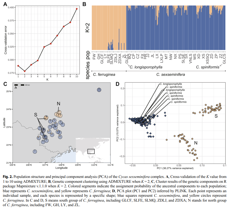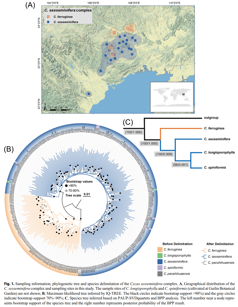 苏铁类植物(Cycads)起源于二叠纪晚期,在晚三叠纪至早白垩纪期间繁盛,是早期地球森林植被的重要成员,在陆生植被和古植物区系演替中扮演重要角色。然而,由于气候变迁、生境破碎化和人为采挖等因素,苏铁类植物野外资源急剧下降,已处于濒危境地,部分种类濒临灭绝,根据国际自然保护联盟(IUCN)的数据,有近63%的苏铁类植物被《濒危物种红皮书》收录;在我国,所有的苏铁属植物均被列为国家一级重点保护野生植物(农业农村部、国家林业和草原局,2021)。苏铁属(Cycas)是苏铁科唯一的属,约有120种,主要分布于亚洲、非洲和澳洲,是现存苏铁属中地理分布范围最广、多样性最高、形态最丰富的一个类群。中国西南地区是苏铁属植物的次生多样化中心,约有22种,兼具形态多样性和生境多样性,也正因为如此,中国苏铁属植物的分类存在不少问题,合格发表的种名多达57个,一些类群的分类有待进一步研究。 中国科学院昆明植物研究所龚洵研究组长期致力于苏铁属植物多样性、演化、濒危机制和保护的研究。先后采用分子和形态相结合的方法对滇南苏铁(C. diannanensis)复合群、叉孢苏铁(C. segmentifida)复合群和台湾苏铁(C. taiwaniana)复合群的物种做了界定。最近,又在TAXON上发表了六籽苏铁(C. sexseminifera)复合群的研究结果。基于整合物种概念(ISC),采集了该复合群4个物种的简化基因组(RAD-seq)和形态数据等进行分析,并采用系统发育基因组学推断、BPP分析、主成分分析等多种分子物种界定方法,澄清了该复合群的物种,解决了以下核心问题: 1. 六籽苏铁复合群被重新界定为2个独立的物种,即锈毛苏铁(C. ferruginea)和六籽苏铁(C. sexseminifera),而长孢苏铁(C. longisporophylla)和刺孢苏铁(C. spiniformis)被归并入六籽苏铁;但因未能调查到短叶苏铁(C. brevipinnata)和七籽苏铁(C. septemsperma)野生种群或栽培材料,这两个物种的分类地位被暂时列为“不确定”,但根据野外调查观测到六籽苏铁分布较广且具有较大的形态变异,推测它们也可能是六籽苏铁的异名。 2. 对复合群下采集的标本等进行了检视溯源,讨论了关键凭证标本的标签信息,并为部分标本的类型(是否属于同一份标本)提出了相关建议。 3. 锈毛苏铁内部存在南北两个遗传分化明显的地理谱系单元。这两个单元形态差异不显著,但在进化上代表了独特的遗传多样性。因此,建议将这两个谱系分别划分为两个独立的演化显著单元(Evolutionarily Significant Units, ESUs)进行就地保护。 研究成果以Integrative species delimitation of the Cycas sexseminifera complex (Cycadaceae) utilizing genomic and morphological data发表于国际植物分类学经典期刊TAXON上,龚洵研究员和冯秀彦副研究员为共同通讯作者,席辉辉博士为该论文第一作者,刘健副研究员参与了该工作。该研究得到了国家自然科学基金项目(31970230)的资助。