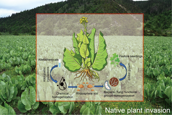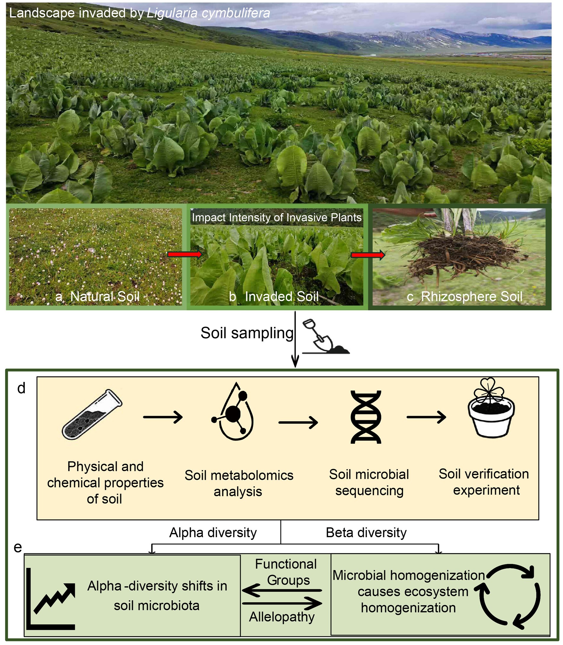 青藏高原高寒草地是维系区域生态安全的重要屏障,支撑着碳汇、水源涵养与畜牧业生产。然而,长期以来,过度放牧与气候变暖的双重压力导致草地严重退化。一个值得关注的新现象是:一些土生土长的植物——如菊科的舟叶橐吾(Ligularia cymbulifera)——正在像外来入侵种一样疯狂扩张,排挤牧草,形成单优群落。有牧民反映,“这地,以前全是牦牛爱吃的嫩草,现在全让这‘黄花草’给霸占了。牦牛见了都绕着走,好端端的牧场就这么毁了。” 这类“本土入侵植物(Native Invasive Plant)”不同于传统的跨界入侵者。它们没有偷渡入境,却在自己的家乡表现出极强的扩张性。已有研究表明,舟叶橐吾能通过根系分泌化感物质(如对羟基苯甲酸PHBA),直接抑制其他植物的生长。然而,以往研究多集中于地上植物竞争,对于这些化感物质如何改变土壤环境进而重塑地下微生物群落,以及这种改变是否会反过来影响牧草生长,认识十分有限。 土壤微生物是草地生态系统功能的核心驱动力。碳循环细菌调控有机质分解,氮循环细菌影响土壤肥力,菌根真菌帮助植物吸收养分,而病原菌则可能加剧植物病害。当一个入侵植物通过化感物质“改造”土壤时,这些功能群会如何响应?是局部繁荣还是整体衰退?不同地点的微生物群落是会变得更加相似(同质化),还是更加分化?这些问题直接关系到草地退化的机制与恢复策略。 该研究在云南香格里拉高寒草甸设置15个配对样本(天然草甸、入侵草甸及根际土壤),测定土壤pH、总碳(TC)、总氮(TN)、总磷(TP)及非靶向代谢组;通过16S rRNA和ITS高通量测序及FAPROTAX/FUNGuild数据库预测微生物功能群;同时以主要化感物质PHBA设置浓度梯度(0-500 mg/L)开展微宇宙实验,以白车轴草(Trifolium repens)为受试牧草,验证化感物质对微生物多样性和幼苗生长的影响。研究发现入侵导致土壤酸化(pH下降)、养分(TC、TN、TP)富集,代谢组丰度升高。在微生物α多样性层面,碳循环细菌和菌根真菌显著增加,其他功能群变化不显著。但在微生物β多样性层面,入侵样地中碳循环细菌、细菌病原菌、菌根真菌和真菌病原菌的Bray-Curtis相异度显著下降,即微生物群落发生空间同质化。盆栽实验证实PHBA单独处理即可诱发微生物功能群同质化,且同质化程度与牧草幼苗的根重、茎长呈显著负相关。综上,该研究发现本土入侵植物通过化感物质介导的土壤酸化与养分富集,导致微生物功能群出现“局部α多样性上升”与“空间β多样性下降”的耦合效应,这种微生物同质化进一步抑制了牧草生长。研究为高寒草地退化提供了“地下武器”新机制,也为生态恢复中调控土壤微生物组提供了科学依据。 该研究以Native Plant Invasion Mediates Coupled Homogenization of Soil Metabolomes and Microbial Functional Groups on the Qinghai-Tibetan Plateau为题,发表在国际植物生态学期刊Journal of Plant Ecology上。云南师范大学孙文光团队与中国科学院昆明植物研究所张亚洲副研究员共同主导该研究,孙文光讲师与张亚洲副研究员为共同通讯作者,硕士研究生刘世简与刘欣为共同第一作者,硕士研究生熊婉吟、叶垚君、殷梦蝶及孙航院士参与该研究。该研究得到第二次青藏高原综合科学考察研究、国家自然科学基金联合基金重点项目、国家重点研发计划、云南省基础研究专项、云南省“兴滇英才”青年人才项目、云南省彩云博士后计划、中国科学院昆明植物研究所人才引进项目等的支持。