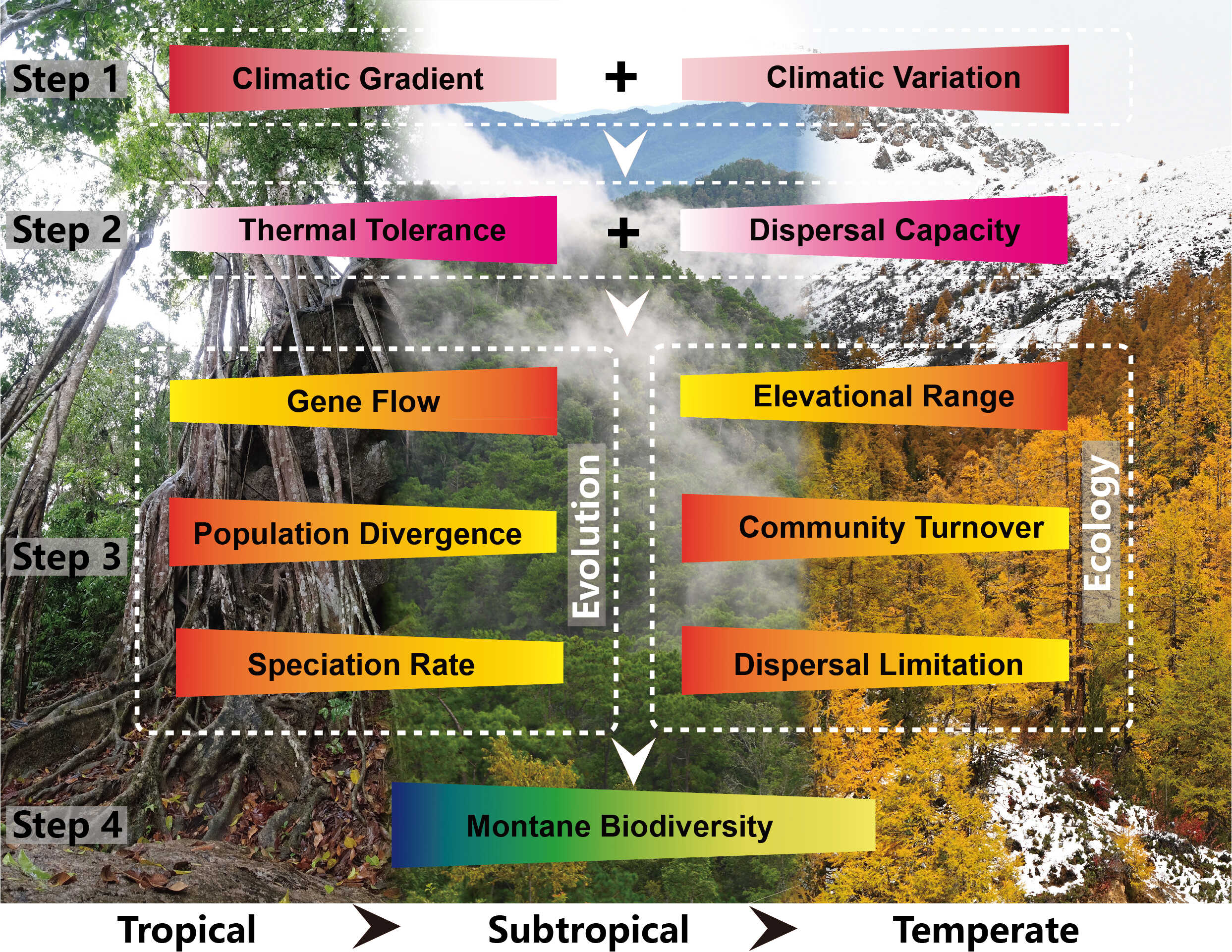 山地生物多样性格局和成因是生态学和生物地理学最古老的主题之一,即洪堡之谜。这其中又蕴含着两个热点议题:“为何热带山地生物如此多样?”以及“什么驱动了山地生物多样性的纬度格局?”。在全球变化背景下,深入阐释上述科学问题具有重要的理论-实践意义,为预测山地生物的未来命运(如扩散、灭绝)、识别脆弱生态系统以及制定合理有效的保护措施提供积极见解。 简森的山口假说(Janzen’s Mountain Passes Hypothesis: Janzen, 1967, The American Naturalist)是山地生物地理学研究中的经典范式。该假说提出:由于热带地区温度波动较小,热带山脉隘口比温带同类地形形成更强的气候屏障,从而筛选出具有狭窄温度耐受范围的生物(图1)。 中国科学院昆明植物研究所孙航院士团队研究人员在与简森老先生交流时,简森老先生风趣地说到: “这并非真正意义上的科学假说,而是野外生态学课程中对学生的真实观察——来自美国的学生对海拔变化带来的天气波动毫不在意,而热带地区的学生却感到极度不适。”(PS:野外观察对于生态学研究的重要性可见一斑) 这一理论解释了热带山地物种海拔分布范围较窄、沿海拔梯度物种周转更快,进而形成更高生物多样性的现象——这些核心观点为理解生物生理适应、物种形成和物种共存奠定了基础。本研究旨在厘清其理论框架,提出严格的验证方法,并延伸其应用以应对全球变化的挑战。通过完善该理论的应用,研究人员不仅能更准确预测生物多样性对气候变化的响应,还将推动生态理论的发展。 该研究指出最近的研究常将该假说与纬度生物多样性梯度混为一谈,或在采样设计中忽视其机制原理。当前研究存在明显的方法缺陷:或仅关注热带山地(缺乏温带对照),或孤立研究非热带系统(无法验证“热带山口更高”的核心论点)。研究人员提出验证简森假说需严格的实验设计,应覆盖完整气候梯度并控制混杂变量。标准化采样需注意:1)统一微环境(温湿度/土壤)测量;2)从山麓到山顶按固定海拔间隔采样;3)考虑坡向等局域气候差异。未来需整合多类群(动物-植物-微生物)响应、界定假说例外情况(如宿主依赖性生物),并结合功能性状与分子手段(如代谢组/宏基因组,尤其涉及温度耐受性基因、生物地球化学循环基因等)揭示生态机制和生态系统功能响应。从相关性分析转向实验验证:可通过移栽实验(如植物交互移栽、微生物牢笼等方法)、历史标本分析及气候变化控制(如增温、季节性干旱等)实验实现。填补这些研究空白不仅能完善山地生物地理学理论,还将为应对日益加剧的环境变化、制定生物多样性热点区域的保护策略提供科学依据。(图2) 该研究以Janzen’s Mountain Passes Hypothesis in a Changing World: Pitfalls and Opportunities为题,发表在国际植物学经典期刊New Phytologist上。中国科学院昆明植物研究所孙航院士团队张亚洲副研究员为论文第一作者,孙航院士为通讯作者,科罗拉多州立大学J. Aaron Hogan博士参与该研究。围绕山地生物地理格局和成因,张亚洲副研究员及其团队近期分别在区域(Zhang et al., 2024 Ecography, 依托版纳植物园森林生态组)和全球(Zhang et al., 2025 Global Ecology and Biogeography)尺度上开展了数据研究,该研究是对前期工作中发现的问题和前景的系统性总结。该研究得到青藏高原二次科考项目、国家自然科学基金、云南省基础研究专项、兴滇人才青年人才项目、云南省彩云博士后计划、中国科学院昆明植物研究所人才引进项目等的支持。