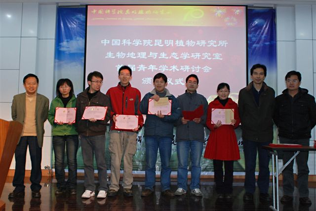 生物地理与生态学研究室: 茶话会由研究室副主任、标本馆馆长彭华研究员主持,刘吉开副所长、甘烦远副所长代表研究所分别致辞。刘副所长在凝练科学研究目标和人才队伍建设方面对研究室提出了两点殷切希望。甘副所长在讲话中以植物化学与西部植物资源持续利用国家重点实验室为例,希望中科院生物多样性与生物地理学重点实验室利用好西南生物多样性实验室建设机遇,搭建更为优良的科研平台。 研究室主任周浙昆研究员代表研究室向全室师生员工和老专家致以节日的问候,向为筹备此次茶话会的工作人员表示感谢,随后介绍了研究室尤其是院重点实验室过去一年的工作进展。2008年,院重点实验室人员共发表研究论文72篇,SCI期刊收录的论文有51篇,有15篇文章发表在JCR前30%的期刊上,总影响因子达到82,是2006年重点实验室成立以来在高层次期刊上发表论文最多的一年,全年新获项目30余项,资助金额达1000余万元。这一年,国家副主席习近平、科技部党组书记李学勇、中科院党组成员郭传杰等领导同志先后到重点实验室视察工作,对重点实验室工作给予了充分肯定。 李锡文、李恒、周铉、武素功等老专家以及刘培贵、龙春林、王红,法 李德铢所长在总结发言中指出,当前,35岁以下的青年科学家和研究生已经承担起推动实验室发展的主力军,青年学者掌握了现代生物学研究进展现状和技术手段。近年来学科发展非常迅速,基因组学的飞速发展直接影响了生物地理学的发展方向,今后,要利用院地合作的有效机制,努力建设以民族植物学和生态学为研究领域的云南省重点实验室,现有院重点实验室要综合考虑,保持生物地理学研究特色,在生物多样性起源、保护和可持续利用做出标志性成果。他表示研究所和重点实验室将充分利用已有基础和政策,为老一辈科学家继续传帮带创造有利的条件。 茶话会还举行了研究室首届青年学术讨论会获奖人员颁奖仪式,所、室领导分别为获得一、二、三等奖的研究生和优胜奖的青年学者颁发了证书和奖金。2008年新回所硕士