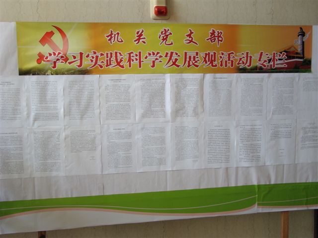 历时近半年的深入学习实践科学发展观活动在所党委的领导下已圆满完成了各项任务,为了建立学习实践活动的长效机制,机关党支部也对本支部学习实践活动的情况进行了全面总结,并制作举办了“机关党支部学习实践科学发展观活动专栏”,对机关支部党员(包括入党积极分子)的学习活动情况进行了宣传。 2、学习形式多样化。个人自学与支部集中学习相结合,并组织了“机关党支部学习科学发展观知识问卷答题”活动。 3、专栏主题展示机关支部党员(包括入党积极分子)个人学习心得体会。大家紧密围绕我所发展所需要解决的突出问题,结合本职工作,就如何理解认识科学发展观、如何贯彻落实科学发展观,尤其是如何在科学发展观的指导下,认真思考制约我所在党务管理、人事(包括离退休)管理、科研管理、财务管理、行政后勤、创新文化建设等方面的主要问题,为推进我所科学发展建言献策。提出了管理工作制度化、规范化,科研、管理、支撑体系统筹发展等意见和建议。