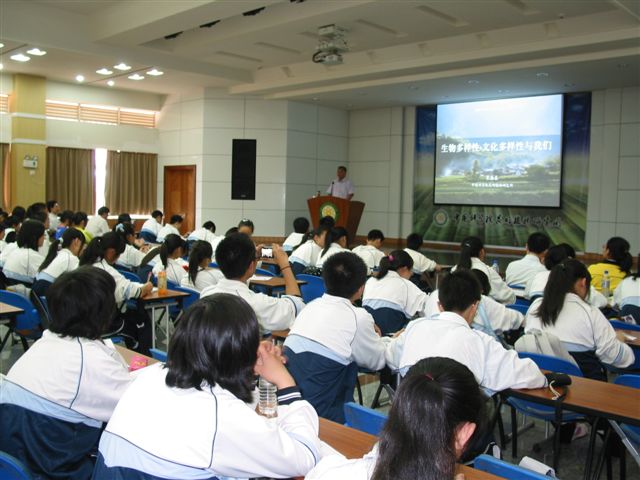 2009年5月17日,我所举办的“中国科学院第五届公众科学日”活动在全所范围内全面展开,中心会场设在我所办公楼学术报告厅。甘烦远副所长主持了开幕式,首先对前来参加活动的单位和师生表示欢迎,利用多媒体影片简单介绍了我所在科学院创新三期中取得的科研成果。接下来,由副所长刘吉开研究员做了题为“生物多样性利用与生物经济”的科普讲座,通过丰富多彩的图片,认真细致地讲解,将高深的生物学专业知识通俗化,进行科学普及。而后,蜚声国际的我所老科学家裴盛基研究员给听众做了“生物多样性、文化多样性与我们”的科普讲座,他用大量生动翔实的事例、风趣幽默的讲解,论述了生物多样性与人类的现在及未来的密切关系。来自云南农业大学、云南地质勘探院、贸易经济学校、盘龙区新迎中学、茨坝中学等单位的近180名师生听取了讲座,专家的讲座内容精彩、科学知识丰富,深深打动和吸引了会场听众,引发了阵阵掌声。