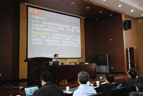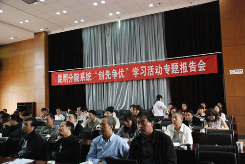 2010年7月29日,昆明分院“创先争优”学习活动专题报告会在分院机关四楼会议室举行,分院系统党员干部60余人参加了报告会。 报告会由分院副院长、党组副书记杨君兴同志主持,特别邀请了云南省委党校党建教研室鲁彩荣教师作“提高党的建设科学化水平的困境与超越”的专题报告。鲁老师以学习解读党的十七届四中全会通过的《中共中央关于加强和改进新形势下党的建设若干重大问题的决定》,充分认识党中央站在时代、历史、全局、战略的高度,提出在新形势下提高党的建设科学化水平的要求,从党的建设科学化的提出及深刻内涵、提高党的建设科学化水平的重要性和紧迫性、提高党的建设科学化水平的思路三个方面阐述和说明如何提高新形势下党建科学化水平的问题。 鲁老师的报告内容丰富、举例详实、语言生动、深入浅出,使参加报告会的党员干部对党的十七届四中全会精神有了更深入系统的认识,增长了知识,开阔了视野,启迪了思维,是一次很好的学习机会。 相关链接如下:http://www.kmb.ac.cn/djgz/zzxc/201007/t20100730_2915530.html 报告会现场1
