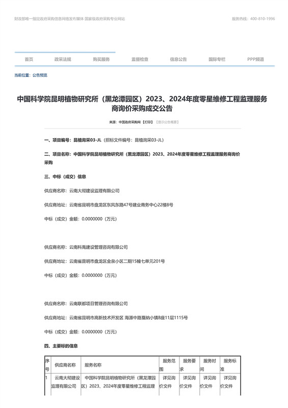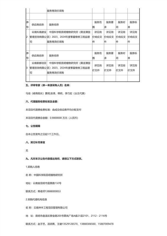 中国科学院昆明植物研究所(黑龙潭园区)2023、2024年度零星维修工程监理服务商询价采购成交公告