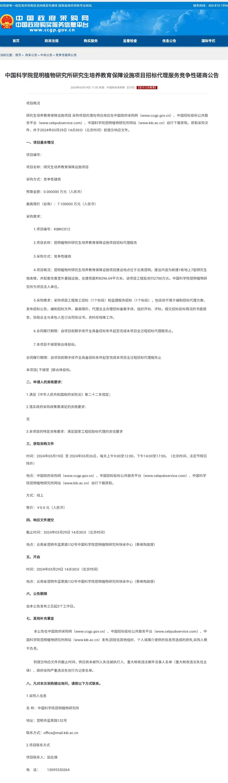 中国科学院昆明植物研究所研究生培养教育保障设施项目招标代理服务竞争性磋商公告