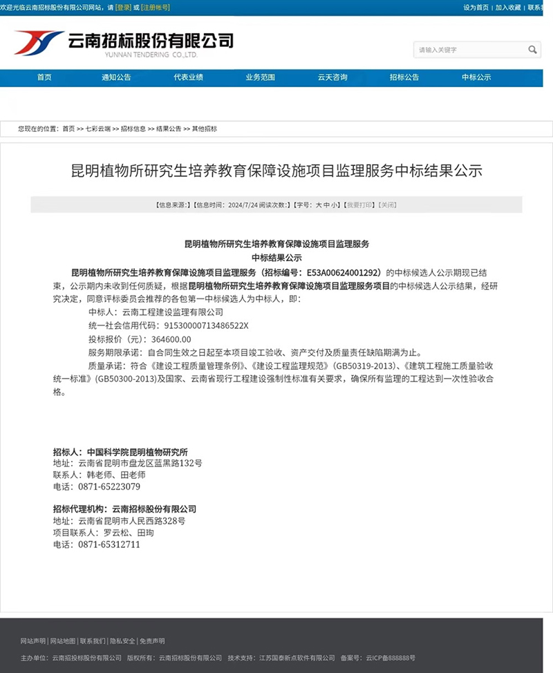 昆明植物所研究生培养教育保障设施项目监理服务中标结果公示(云南招标股份有限公司)
