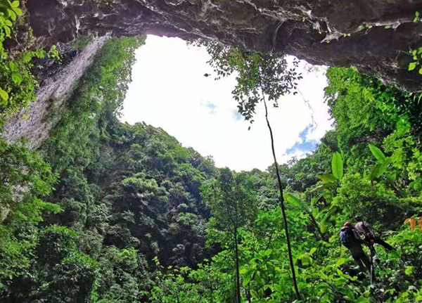 据悉,天坑是喀斯特地区石灰岩地层经过地下河不断冲刷岩层并最终地表塌陷形成的一种规模较大的陷坑状负地貌形态。其四周岩壁陡峭,独特的地质地貌形成了有别于周围区域的小气候和适合生物生存的独特生境。国内外对天坑植物群落的研究,以及近年天坑中众多新种和新记录的发现表明,天坑内部形成的相对独立的生态系统,为多种植物的生长发育提供了避难所,其更容易分化形成有别于周边区域的生物类群,具有植物种类丰富、植被类型特殊、区系成分异常等特点,因此对生物多样性的研究具有重要的科学价值。