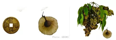 古代铜钱、云南金钱槭果实、云南金钱槭果枝(从左到右) 云南金钱槭 (Dipteronia dyerana)是我国特有植物,为高5-12米的落叶乔木,具有极高的科研、经济与生态价值。 云南金钱槭的果实呈圆形,四周为纸质周翅,较薄;直径为2.39-4.86 厘米;9-10月成熟后就由绿色变成了黄褐色,在形色、大小上都似一枚古铜钱。且由于该种的天然分布地就为云南,故名云南金钱槭。云南金钱槭的多枚果实常常簇生于一个果枝上,远看就如许多穿在一起的铜钱串。一阵秋风吹过,云南金钱槭的果实就会盘旋而下,再在地上随风翻飞一番,远离母株,创造属于自己的天地去了。 由于云南金钱槭的分布区较狭窄,仅限于云南省屏边、蒙自、文山、富宁等县;生境特殊,易受人为干扰;植株常遭砍伐作薪,种群小而分散;种子富含脂肪,可榨油供食用及工业用,常遭采摘,加之种子仅有薄薄果皮和种皮在起保护作用,在自然条件下贮藏期只有两年,自然更新困难,故而濒危,现被定为国家Ⅱ级保护植物,急需保护。