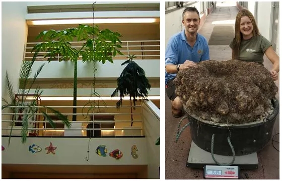 巨魔芋巨大的叶片和球茎(图片来自网络) 巨魔芋在营养周期的生长过程中,每年都只长出1片叶子,在生长周期的后阶段,叶柄可高达3-4m,叶片直径超过5m。巨魔芋通常需要经过至少7年的积蓄,球茎长到50cm左右且储存足够的养分后才能开花。 进入生殖周期后,首先形成的是“肉穗花序”。在肉质的花序轴上,密集地生长着许多小花,雄花在上,雌花在下,它们一起构成“肉穗”,并且被一大片“佛焰苞”裹起来。肉穗花序会自己发热,温度可达36℃以上,大量散发出模仿腐肉的臭气,这些气味物资主要为二甲基二硫化物和二甲基三硫醚,吸引食腐的昆虫麻蝇和埋葬甲来传粉。
