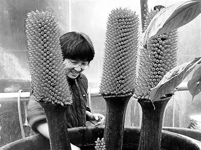 巨魔芋的生活史示意图(图片来源:果壳网) 据不完全统计,印度尼西亚已经失去了72%的原始热带雨林,并且情况仍在恶化,这导致巨魔芋的原始生境受到了直接的破坏,帮助巨魔芋传播种子的马来犀鸟也成为濒危物种,巨魔芋的野外生存状况更是岌岌可危,早在1997年被列入IUCN红色名录。 现在,全球很多植物园都在开展巨魔芋的种植工作,但种子对播种环境要求比较高。种子播种前需要洗净肉质外种皮,用消毒溶液消除病菌隐患;播种土壤也需要灭菌消毒、疏松、透气、适当偏酸性,保证不污染种子,保持土壤湿润;对于温度,需要白天35℃以上,晚上20℃以上,45天左右巨魔芋种子才可能破土出苗。 育苗期间,环境相对湿度需保持在80%-85%,阳光不能直射。巨魔芋为高温季节生长的植物种类,盛夏高温时需对植株周围的地面喷水,用于降温。每年的11月份以后,叶片会逐渐变黄脱落,球茎进入休眠季节,要将植株移入温暖的环境,保持温度在10℃以上,控制浇水,保持环境干燥,使之安全越冬。