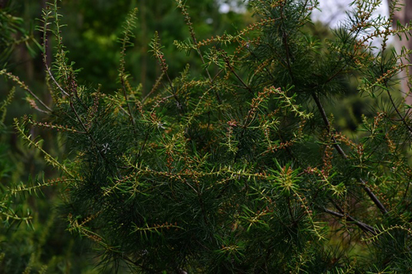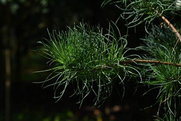 新发的针叶 毛枝五针松是高达20米的乔木,干形通直、树形优美、姿态高雅,是优良的园艺观赏植物。但生长很缓慢,据测量,胸径达到40厘米的树木,需要生长150年左右,可作盆景;木材芳香耐久,材质致密坚韧,是制作高档家具的优良材料。