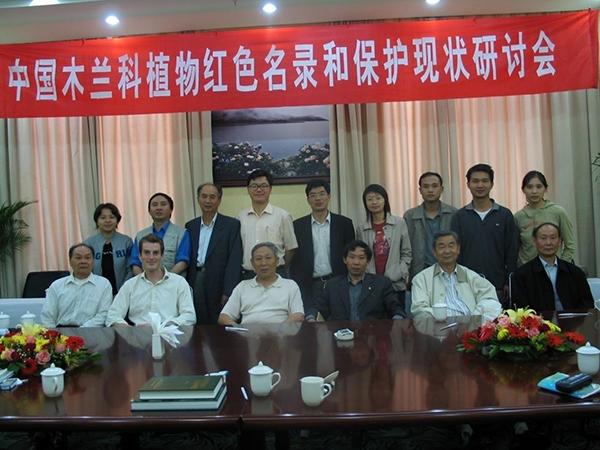 2004年孙主任赴文山州参加中国木兰科植物红色名录和保护现状研讨会 焕镛木Woonyoungia septentrionalis是木兰科Magnoliaceae焕镛木属Woonyoungia单种属植物,又名单性木兰,是木兰科中唯一花单性、雌雄异株的物种,别名细蕊木兰。常绿乔木,花期5-7月,花开时极为芬芳,雄花的花被片白带淡绿色,外轮3枚,内轮2枚,雄蕊群白色带淡黄色;雌花的外轮花被片3枚,偶见4枚,内轮花被片8-10枚,雌蕊群绿色。聚合果近球形,果皮革质,熟时红色。果期10-11月。