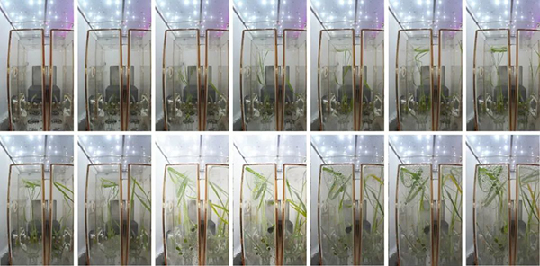 拟南芥 图片来源:中科院分子植物卓越科学创新中心 7月28日,载有实验样品拟南芥种子和水稻种子的实验单元,由航天员安装至问天实验舱生命生态科学实验柜的通用生物培养模块中。8月29日,一个月的时间,拟南芥和水稻种子就在中国空间站问天实验舱成功萌发、长出幼苗了。