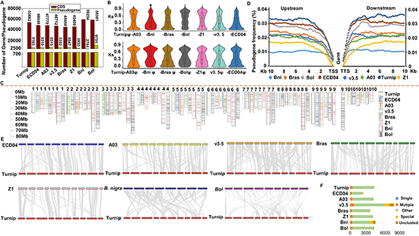 青藏高原种植的蔓菁 杨永平 摄 近日,中科院昆明植物研究所团队前期发现,相比于其他芸苔属AA基因组蔬菜,蔓菁具有较强辛辣味,而芸苔属蔬菜的风味差异主要受自身产生的芥子油苷及其水解产物的含量和类型决定。 中科院昆明植物研究所在Plant Communications上发表研究论文,揭示假基因的不同进化模式对芸苔属亚种蔓菁和白菜风味差异的影响。 中国科学院昆明植物研究所青藏高原植物进化与适应课题组发表蔓菁基因组在Plant Communications上发表题为“Differences in pseudogene evolution contributed to the contrasting flavors of turnip and Chiifu, two Brassica rapa subspecies”的研究论文。通过对青藏高原的蔓菁进行全基因组测序以及与已经发表的芸苔属二倍体近缘种进行比较基因组学及假基因的进化模式分析、脂肪族芥子油苷代谢分析和基因功能分析,揭示脂肪族芥子油苷代谢通路中假基因的不同进化模式对芸苔属亚种蔓菁和白菜风味差异的影响,为芸苔属作物的育种提供指导作用。 研究发现,假基因的数量在芸苔属近缘种间差异较大,并在染色体上呈不对称性分布。同属于AA基因组的芸苔属植物中,白菜基因组中假基因的进化速率快于蔓菁,其功能主要与植物代谢合成相关,推测是造成蔓菁和白菜风味的多样性的主要原因之一。