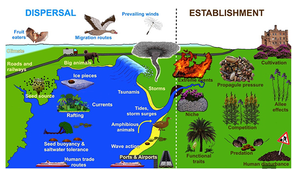 图1、种子/果实的多样性 扩散(Dispersal)一直是生物地理学和生态学的一个核心研究议题。在植物界,种子的扩散往往需要借助媒介完成,并且大多是短距离扩散(local dispersal),仅有约1%的扩散是长距离扩散(long-distance dispersal, LDD)。然而,长距离扩散却是生物多样性格局形成的关键驱动力,对生态系统的维持和稳定有着重要影响,是制约植物种群和群落大规模动态变化的关键要素。种群间的基因流、空白生境的拓殖和集合群落的重组,这些生态过程都与长距离扩散密切相关。此外,长距离扩散也可能剧烈扰动植物的演化进程。例如,一些物种经长距离扩散后拓殖到新的生境成为入侵物种,严重影响当地的生态系统和社会经济。在当今全球环境变化影响下,植物经长距离扩散可形成新的物种分布样式,以适应气候和生境变化。与此同时,长距离扩散对碎片化景观中群体的维持也有重要作用。然而,以往的研究主要聚焦在扩散的动因、过程及媒介等方面,对扩散后植物在新的生境中如何拓殖关注甚少;而物种能否在新的生境中存活并建立种群是评价长距离扩散成功与否的重要标准,但其影响因素和形成机制尚不清楚。
