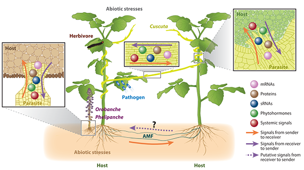 自然界中,植物并不是孤立存在的,而是经常与其他生物产生形式各异的互动。植物与植物之间,通过地上和地下部分产生的挥发物,以及利用根际分泌物“交流”互作,已得到科学界的较深入研究。 日前,中国科学院昆明植物研究所吴建强研究员团队受邀在著名国际期刊《植物生物学综述年刊》上发表关于植物与植物间通信的综述文章。 一系列的研究表明,寄生植物与寄主间可以进行物质与信号交流;此外,丛枝菌根真菌的菌丝也能在地下连接各种植物根系,形成庞大的菌根网络,在不同宿主植物间传递信号与物质。