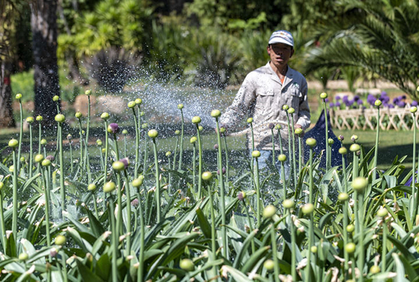 ![]() 4月3日,一名工作人员在昆明植物园中乌全球葱园(昆明中心)为葱属植物浇水。新华社记者 陈欣波 摄